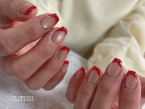 ☆フレンチ☆ 2025/11/15 Staff Blog ☆ 赤フレンチ 可愛い♡ ベースのマグネットもラメ入りで キラキラ・:*+. – – #マグネットネイル #三軒茶屋 #三軒茶屋ネイルサロン #三軒茶屋ネイル #三茶ネイルサロン #三茶ネイル #定額ネイル